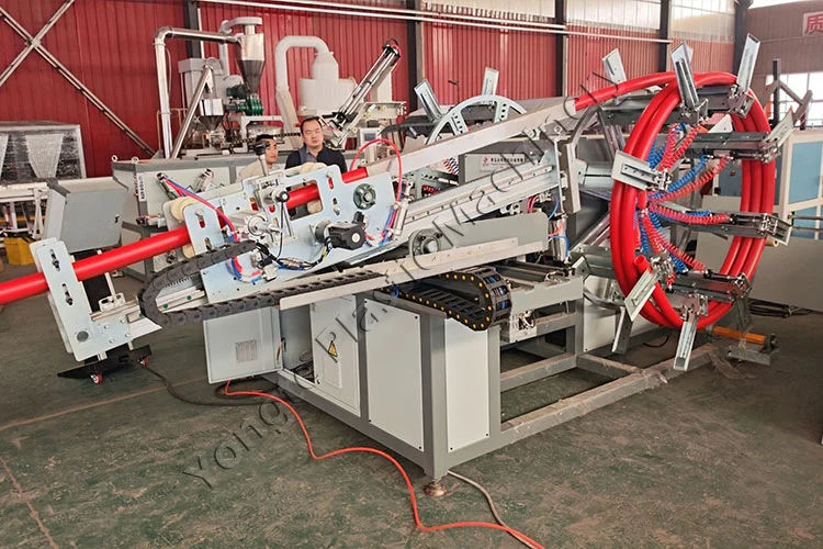 V roku 2025 sme úspešne dodali dve prispôsobené súpravy automatických strojov na navíjanie PE rúr poprednému argentínskemu podniku na spracovanie plastov. Klient požadoval vysokoúčinné riešenia vinutia, ktoré by zodpovedali ich novo rozšíreným vysokorýchlostným linkám na vytláčanie PE rúr. Objednávka zahŕňala dve špecializované jednotky: jeden dvojpolohový automatický navíjací stroj optimalizovaný pre rúry s priemerom 15-32 mm a ďalší vysokokapacitný model určený pre priemery 20-63 mm. Tieto stroje sa hladko integrujú s vysokorýchlostnými linkami na vytláčanie PE rúr na automatické navíjanie rúr do rovnomerných kotúčov. Stroj je vybavený systémom automatického počítania dĺžky a po dosiahnutí cieľovej dĺžky spustí automatické rezanie a presun stanice. Súčasne zaisťuje hotovú rolku a aktivuje alarm na balenie, čím poskytuje plne automatizované riešenie navíjania. Prísne továrenské testovanie pred odoslaním zaistilo stabilnú prevádzku na mieste po dodaní.