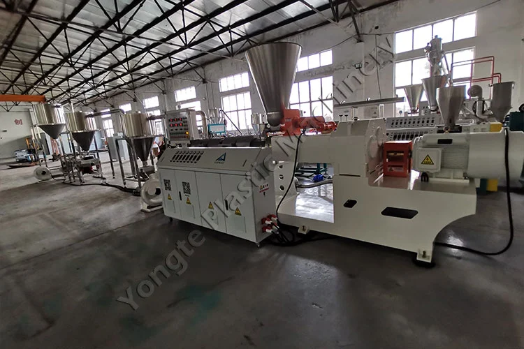 V roku 2024 sme pre poľského klienta skonštruovali vlastný peletovací stroj na báze PVC, špeciálne navrhnutý na výrobu granúl predzmesi PVC z recyklovaného PVC a CaCO₃ plniva. Obsah CaCO₃ plniva je možné flexibilne nastaviť medzi 40 % a 80 % tak, aby zodpovedal výrobným špecifikáciám zákazníka. Medzi kľúčové komponenty patrí automatický podávač, kužeľový dvojzávitovkový extrudér SJSZ80/156 (75kW motor s frekvenčným meničom ABB, spotreba ~50KW počas stabilnej prevádzky), horúca peletovacia matrica pre rovnomerné rezanie granúl a trojstupňový systém rýchleho chladenia a dopravy vzduchom z nehrdzavejúcej ocele 304. Stroj dosahuje výrobnú kapacitu 300-400 kg/hod a je stavaný na nepretržitú prevádzku 24/7 s nulovými prestojmi. Inštalácia bola bezproblémová, s podporou odborného tímu Yongte, ktorý poskytol komplexnú pomoc. Školenie na mieste po inštalácii umožnilo personálu klienta odborne obsluhovať zariadenie, zatiaľ čo vzdialená technická podpora prostredníctvom videonavádzania zabezpečila rýchle vyriešenie akýchkoľvek problémov, udržanie neprerušovanej výroby a špičkového výkonu.
